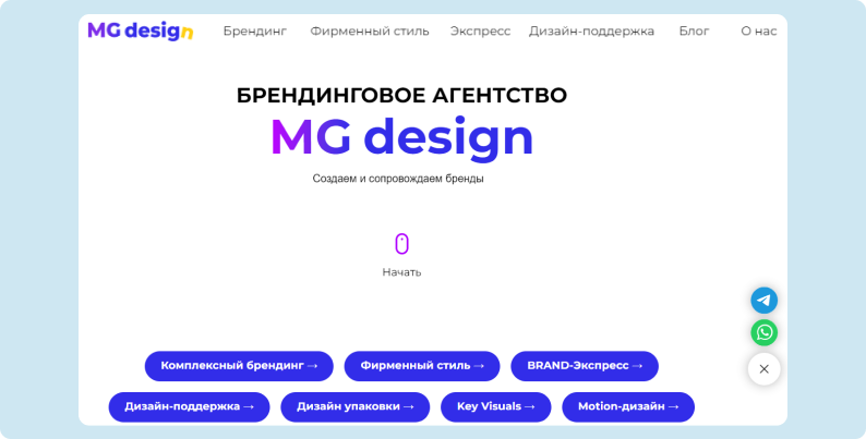 Брендинговое агентство на главной странице перечисляет услуги, которые оказывает и дает несколько способов связи