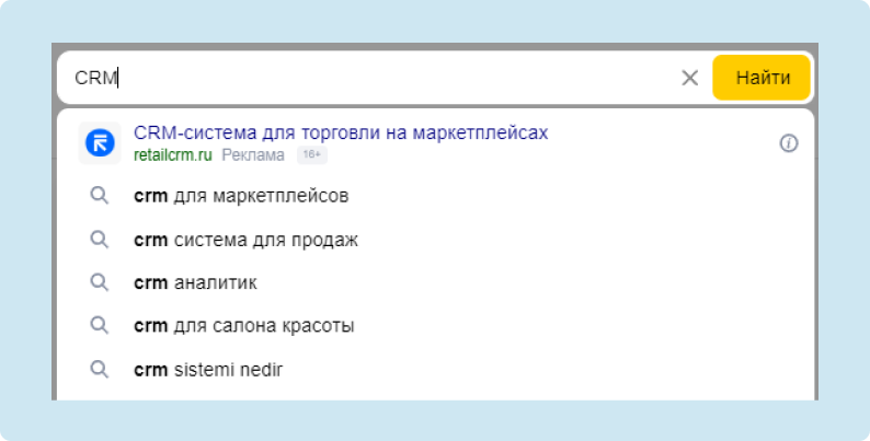 Поисковая. Такие объявления отображаются на первых строках поиска, когда пользователь набирает ключевую фразу. Например, человек вводит запрос «бизнес-аналитика» и видит на первых позициях поисковой выдачи подходящие сервисы для бизнеса. Это могут быть не самые популярные предложения. Поисковик покажет вначале именно те сервисы, владельцы которых купили рекламу.