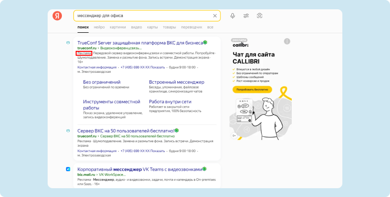Контекстное объявление в поисковой выдаче можно отличить по слову «Реклама» в описании результата