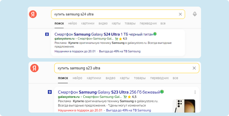 В динамическом объявлении одного и того же магазина меняется модель рекламируемого товара и ее характеристики в зависимости от запроса