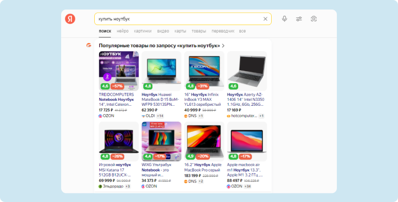 Поисковик выдает конкретные предложения в разных онлайн-магазинах в начале или середине списка. Кроме представления товара, такое предложение помогает пользователям сравнить цены и сэкономить время, перейдя к покупке прямо из поисковой выдачи.